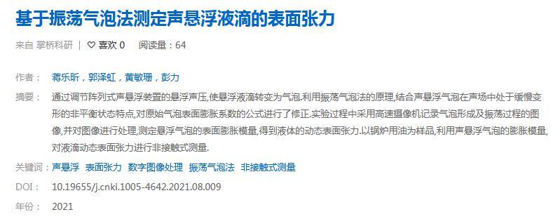 以鍋爐用油為樣品,利用聲懸浮氣泡的膨脹模量,對液滴動態表面張力進行非接觸式測量。