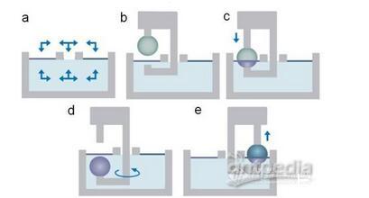 交替型LB膜分析儀的鍍膜過程如圖3所示。當(dāng)使用兩個單分子層壓縮沉積池和一個空白沉積池時,可實現(xiàn)交替鍍膜,浸漬過程可在3個沉積池中選擇任意路徑多次循環(huán)(圖3a);在共同的亞相(淺藍(lán)色)上方,有兩種不同的單分子層(紫色和深藍(lán)色)(圖3b);上臂將樣品向下通過單分子膜,由下臂接住樣品。沉積循環(huán)也可從亞相開始,進(jìn)行第一層鍍膜(圖3c);下臂可根據(jù)需要旋轉(zhuǎn)到另一單分子層的沉積池或空白沉積池中,改變沉積池(圖3d);下臂提起樣品,傳遞給上臂(樣品從任意一側(cè)通過兩個單分子層中任意一個),進(jìn)行第二層鍍膜(圖3e)。