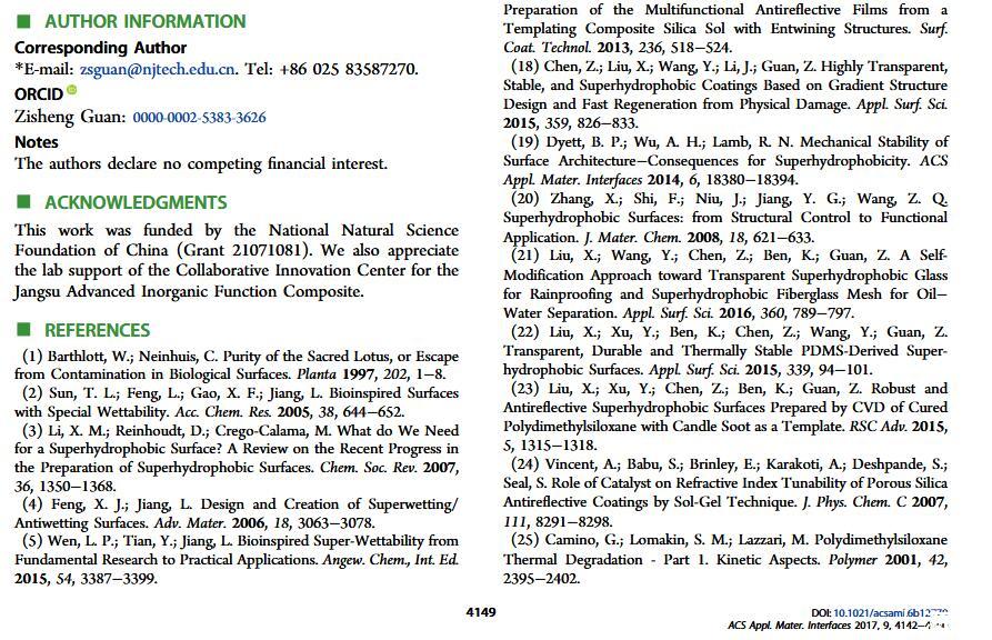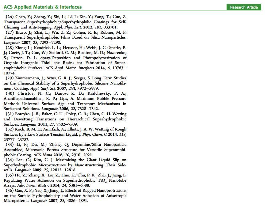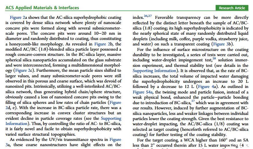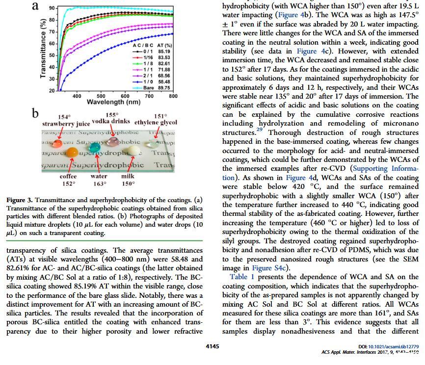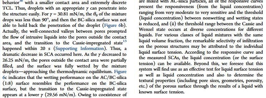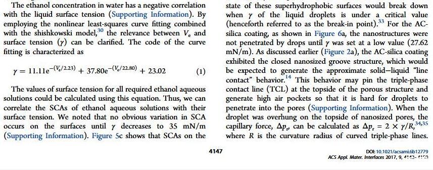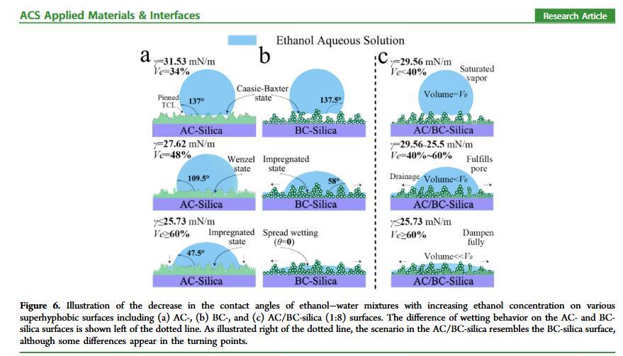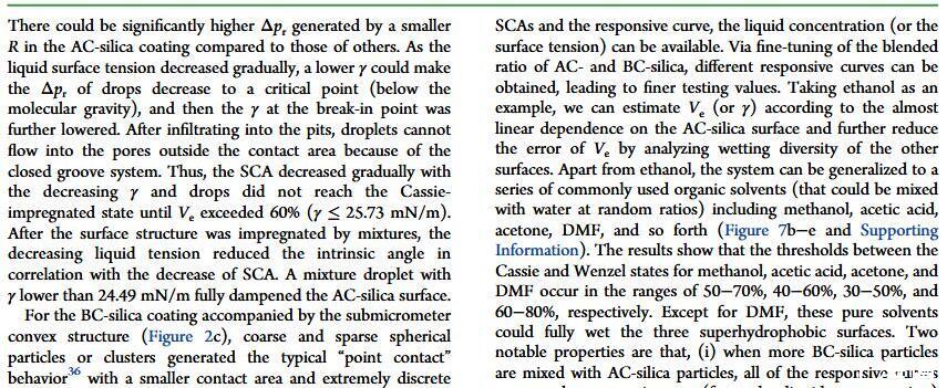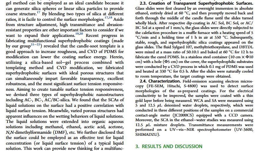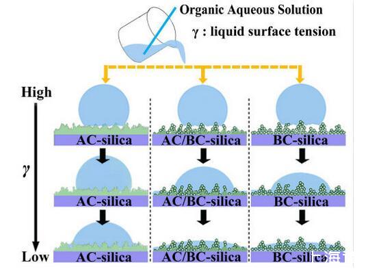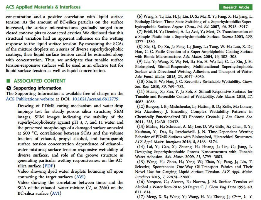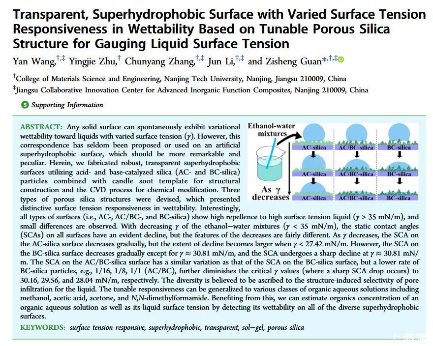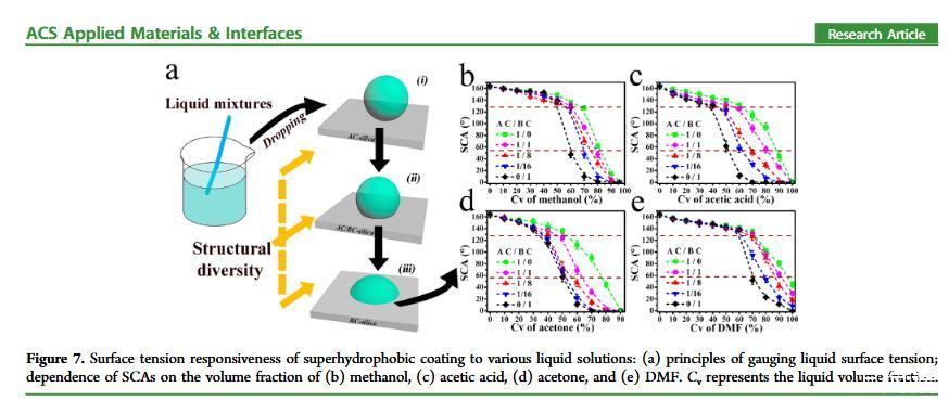 當液體的表面張力發生變化時,它在普通固體表面的潤濕性也會隨著變化。然而,關于這一規律以及尤其是在超疏水表面的表現的研究很少。最近,協同創新中心PI-6管自生老師課題組研究生王研等人利用上述的表面張力和潤濕性的響應關系首次將透明超疏水涂層應用在探測液體表面張力方面,為拓寬多功能超疏水涂層的應用提供了一個新的思路,相關論文已被ACS applied materials&interfaces發表。研究表明,隨著有機物水溶液中有機物體積分數上升,溶液的表面張力相應地下降,溶液液滴在制備的超疏水涂層的接觸角也逐漸下降,此稱之為表面潤濕性對表面張力的響應?;诖隧憫P系,可以通過接觸角估測液體的表面張力以及有機物的濃度。