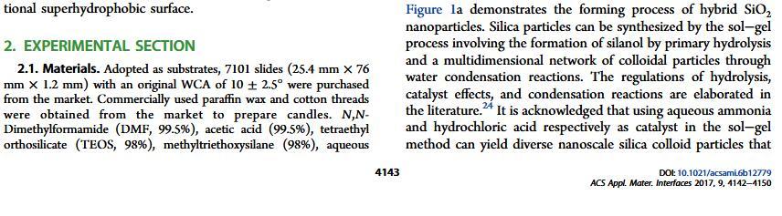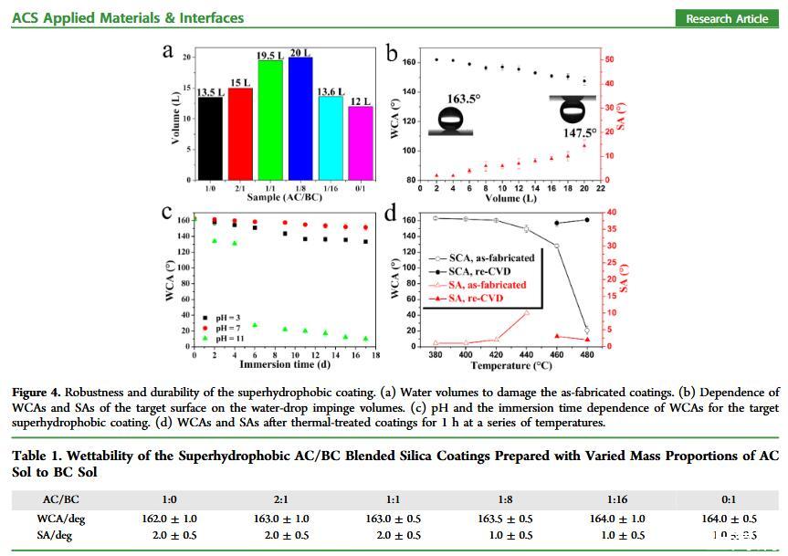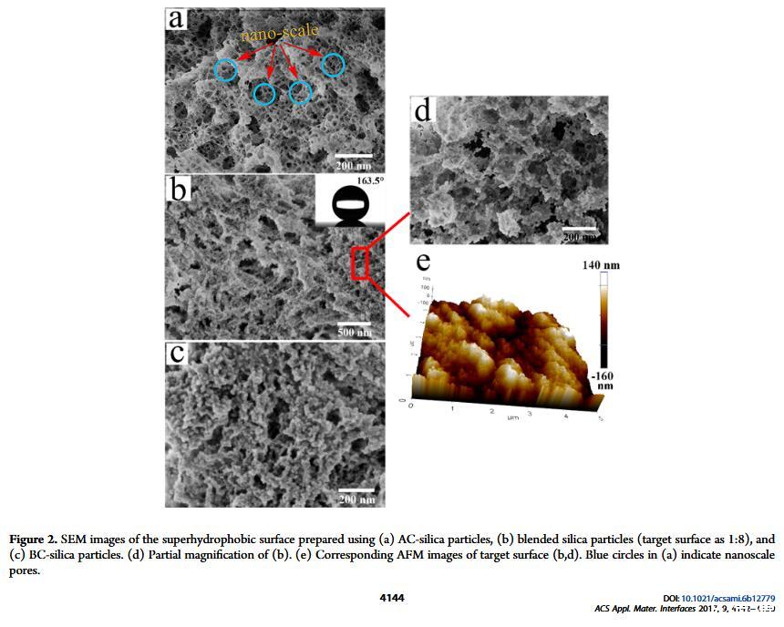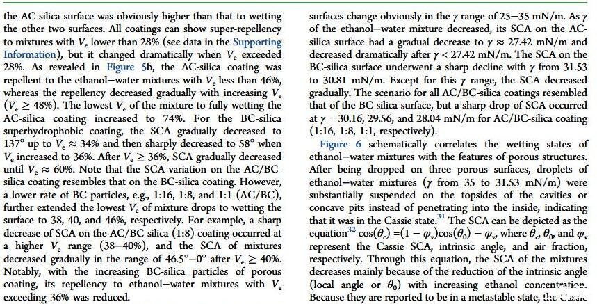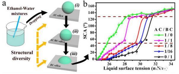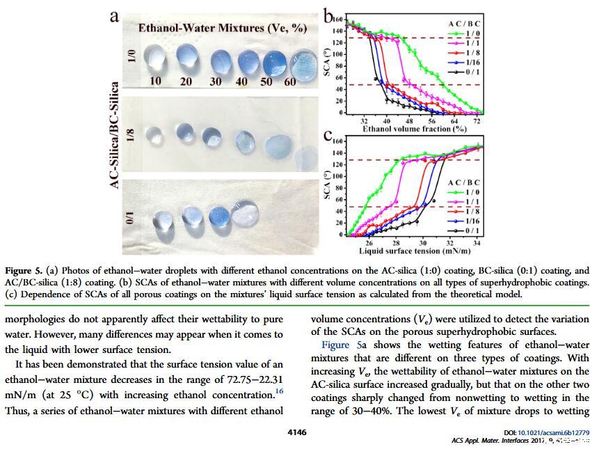 結果表明,以正硅酸四乙酯為前驅體通過酸性和堿性水解法制備了不同形貌的納米二氧化硅溶膠,通過混合兩種溶膠可制備出具有顆粒間鍵橋強度高的亞微米級凸起和納米級凹坑的結構的涂層。通過控制酸堿催化溶膠混合比例,我們可以制備出具有不同微觀結構的超疏水涂層。結果表明具有不同結構的涂層具有不同的潤濕性-表面張力關系,隨著涂層制備時堿催化溶膠的比重增加,納米級凹坑結構逐漸減少,表面更容易被低表面張力液體侵入,因而接觸角下降更劇烈。并且在有機物水溶液,包括:甲醇、乙醇、正丙醇、異丙醇、乙酸、丙酮、N,N’-二甲基酰胺等,都具有同樣的接觸角和濃度(表面張力)響應規律。