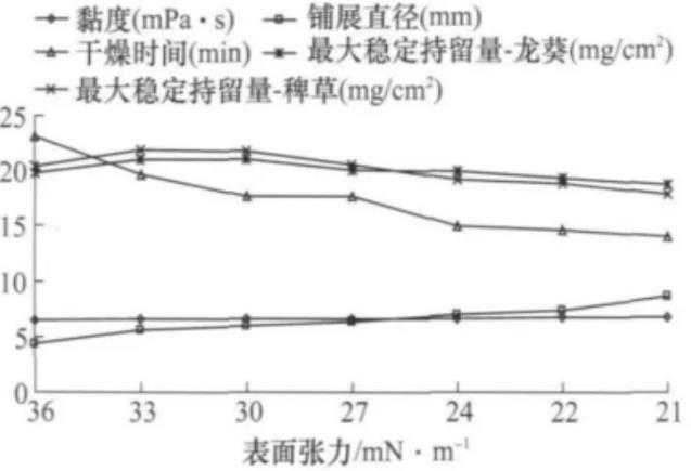 改變草甘膦藥液的表面張力,其生物活性最佳區間是表面張力在22~24mN/m,藥液的黏度在6.58~6.7mPa·s之間,液滴的鋪展直徑在7~7.4mm,干燥時間在14.52~14.98min,龍葵和稗草葉片表面的最大穩定持留量分別在19.23~19.86、18.72~19.16mg/cm2之間,對龍葵和稗草的目測防效最高可增加42%和37%左右,鮮重防效最高可增加41%和37%。通過改變草甘膦藥液的黏度,其最佳活性區間為黏度超過14.5mPa·s,表面張力低于31.5mN/m,液滴的鋪展直徑達到4.83mm,干燥時間低于21.49min,龍葵的最大穩定持留量超過23.18mg/cm2,稗草的最大穩定持留量超過25.10mg/cm2,對龍葵和稗草的目測防效都可提高42%,鮮重防效可提高42%和41%。