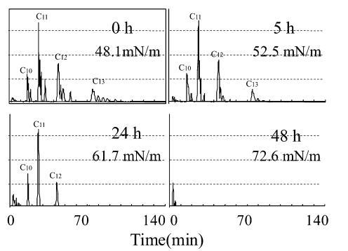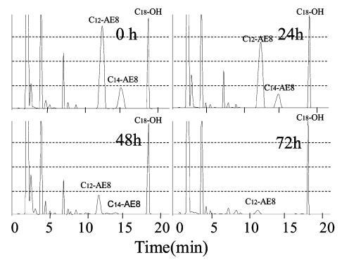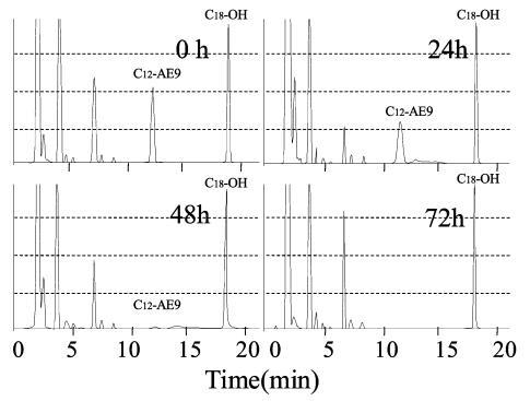 用高效液相色譜法分析生物降解過程中AE 的色譜圖如圖8 所示,其中10 毫克/升C12-AE9 的峰出現在11 分鐘的保留時間,作為內標的C18 醇出現在18 分鐘的保留時間。 在 8 分鐘的保留時間之前觀察到主要由衍生產物引起的干擾峰。 10mg/L AE9 的大部分峰在 48 小時后消失(圖 8),而圖 3 中此時基于需氧量的生物降解保持 35%。此時表面張力值達到約 72.8 mN/m . 因此,表明AE9在其生物降解率低于50%的時間內失去了其界面活性和水生毒性。