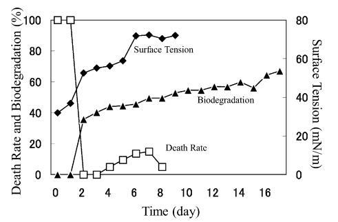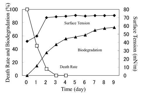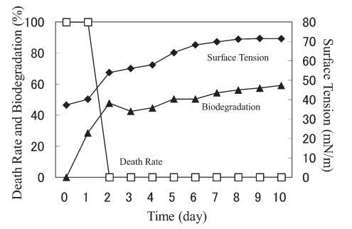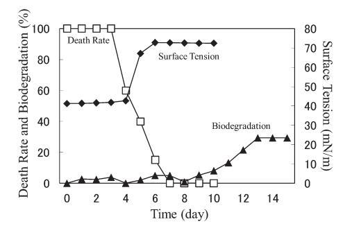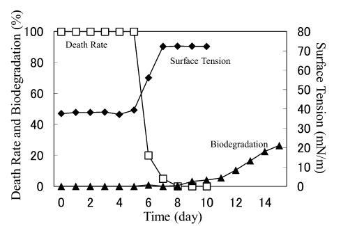 在 10 mg/L AE9 的情況下,在第 6 天進行重新添加,因為此時死亡率和表面張力已穩定下來。 重新添加后第2天表面張力恢復到蒸餾水的水平,死亡率在暫時增加到80%后立即下降到0%(圖14)。 因此得出結論,AE9 在重新添加后 24 小時內發生了初級生物降解,這表明馴化加速了 AE9 的初級生物降解。