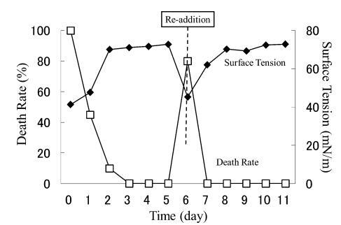 結果,在第8天重新加入LAS使試液的表面張力降低到與初始階段相同的水平,但死亡率沒有達到100%。 重新添加后不久,觀察到表面張力值迅速增加,水生毒性和死亡率迅速下降。 重新添加 LAS 后,死亡率暫時增加,但隨后立即降至 0%。 重新添加后第 2 天,表面張力值達到約 72.8 mN/m。