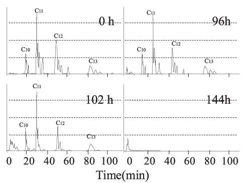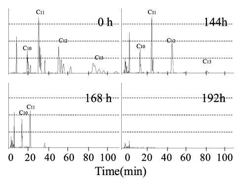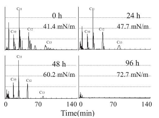 生物降解過程中10mg/L LAS的色譜圖,通過HPLC使用UV檢測器進行分析,如圖6所示。在相應的保留時間(RT)處出現不同碳鏈數的峰組:16至19.5分鐘為C10,26.5至32.5分鐘是C11,44到55分鐘是C12,74到95分鐘是C13。 由于苯基的結合位置不同,每個峰組都包含異構體峰。 參考標準(和光純藥工業株式會社)用于識別每個峰。