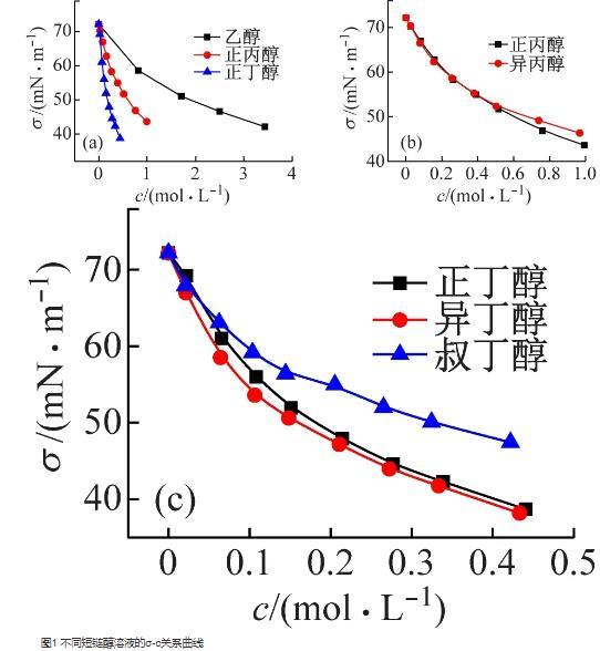 6種短鏈醇溶液分子結(jié)構(gòu)對表面張力和表面吸附性能的影響