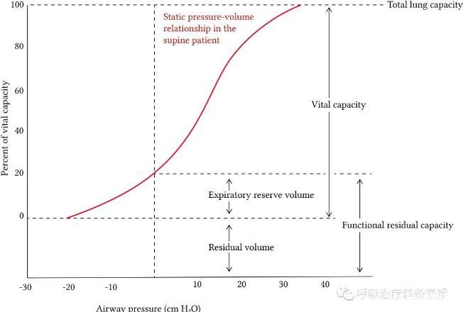 它展示了經典的肺順應性曲線,在低和高容量時順應性較差,但在FRC之上,即在正常潮氣量的范圍內是最佳的。