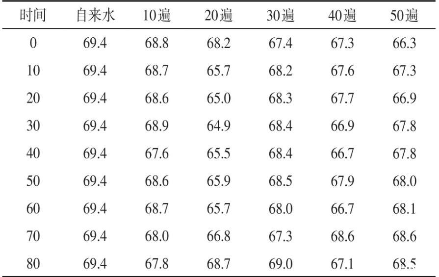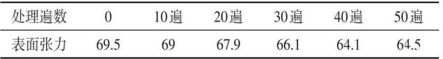 由圖表分析可知,自來水經過不同遍數處理后,其表面張力值均有所下降。磁場強度為1.0 T時,下降幅度范圍為1.0~3.0 mN·m-1。處理50遍時,水的表面張力減小的幅度約為3.1,相對于自來水的表面張力減小了4.5%;當水被處理30遍到40遍時,水的表面張力的下降速率出現明顯減緩的趨勢,水的表面張力僅僅減小了0.1 mN·m-1,相對于水被處理20遍到30遍時表面張力下降值的百分比為12.5%。