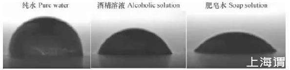 由上式可以看出,基質(zhì)吸力的大小與表面張力、接觸角和曲率半徑有關(guān)。其中,基質(zhì)吸力的大小與表面張力成正比,與彎液面曲率半徑成反比。因此,表面張力和曲率半徑的變化均會導(dǎo)致基質(zhì)吸力的改變。在環(huán)境溫度為25℃時(shí),通過JC2000型接觸角測量儀對三種試樣的孔隙液體進(jìn)行接觸角測量。得到三種不同表面張力液滴的幾何形態(tài)圖如圖1所示,測量可得純水、酒精溶液和肥皂水對應(yīng)的接觸角分別為85°、65°和42°,而在25℃環(huán)境下,純水、20%酒精溶液、2 g L-1肥皂水的表面張力系數(shù)分別為:7.1×10-2N m-1、4.1×10-2N m-1、2.9×10-2N m-1。表面張力是決定彎液面形狀的主要因素之一,會影響曲率半徑和接觸角的大小。很顯然,表面張力大的液體接觸角變大,曲率半徑變小。圖1中水滴表面張力大于酒精溶液,但形成的彎液面半徑卻要小于酒精溶液,同樣的,酒精溶液形成的彎液面半徑又小于肥皂水。曲率半徑越小,土體中的基質(zhì)吸力越大。孔隙水表面張力會對彎液面的曲率半徑產(chǎn)生改變從而對基質(zhì)吸力產(chǎn)生影響,最終影響土壤的收縮開裂。