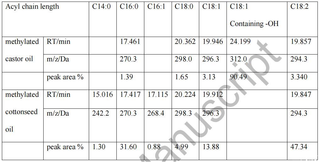 表1 甲基化蓖麻油和棉籽油中的物質(zhì)及含量