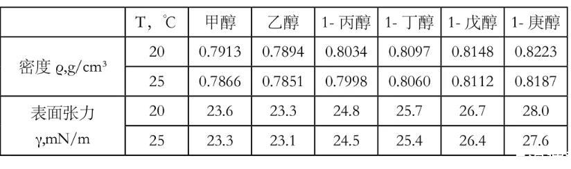 表面張力的意義,醇類在不同溫度下的表面張力測定數據