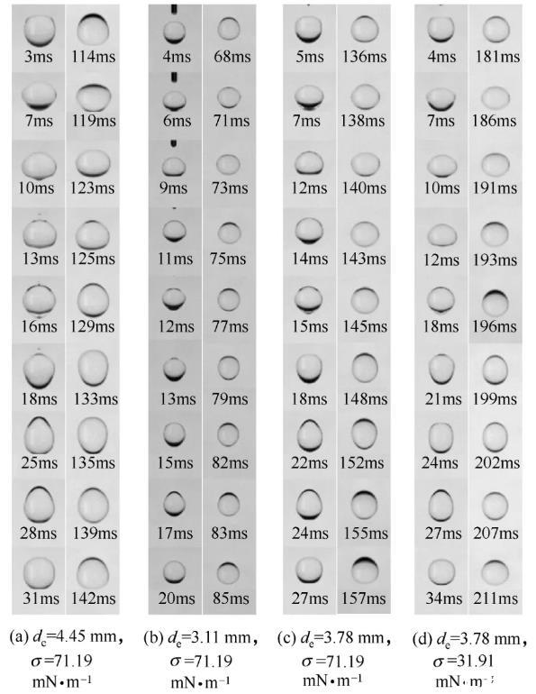 液滴運動過程中的形狀變化對液滴的蒸發(fā)、燃燒等過程有重要影響,表面張力是影響其形狀變化的因素之一。為研究表面張力對液滴形變的影響規(guī)律,采用低濃度的表面活性劑(十二烷基苯磺酸鈉SDBS)配制表面張力為30~72 mN·m?1的水溶液。利用不同外徑的針管得到3~5 mm粒徑的液滴。高速攝像機(Phantom V211,1000 pps,800×600 pixel)對這些液滴在自由落體過程中的形變規(guī)律進行了可視化實驗研究,得到了關(guān)于E?tv?s數(shù)(Eo)的半經(jīng)驗關(guān)系式。實驗結(jié)果表明,液滴在自由落體過程中會形成周期性振動形變,振動周期和振幅隨表面張力增大而減小。進一步研究發(fā)現(xiàn),初始時液滴形成并斷裂所引起的瞬態(tài)沖量使液滴內(nèi)部動量傳遞進而表現(xiàn)出周期性振動形變。