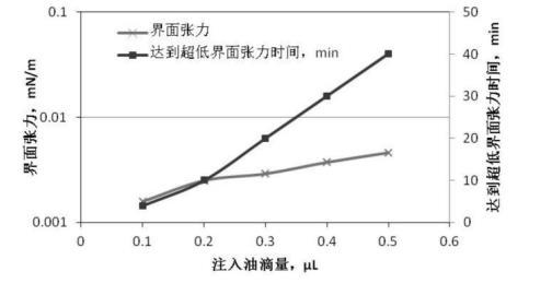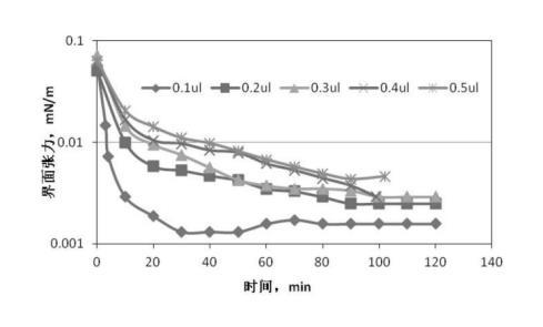 圖3、圖4是根據(jù)前述實驗步驟1、2提供的配置與測量方法,油滴注入量分別為0.1μL、0.2μL、0.3μL、0.4μL、0.5μL,無堿二元驅(qū)配方體系與高凝油間界面張力的關(guān)系曲線。從圖2可知:無堿二元驅(qū)配方體系與高凝油間的界面張力達到超低界面張力的時間隨著油滴注入量的增多明顯延長,注入油滴0.1μL,4分鐘達到超低界面張力,注入油滴0.5μL,40分鐘達到超低界面張力;從圖4可知:注入油滴量大于0.3μL以后,對無堿二元驅(qū)配方體系與高凝油間界面張力的測定不能持續(xù)2小時,油滴在100分鐘發(fā)生斷開,對于高凝油而言,油滴注入量小于0.3μL較適合。