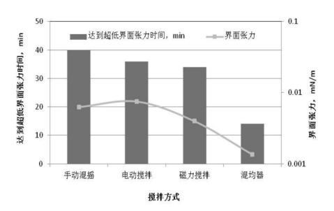mN/m;手動混搖的方式達到超低界面張力的時間最長,為40分鐘,電動攪拌和磁力攪拌差別不大?;靹蚱鲾嚢璺绞绞谷芤耗茉诙虝r間內(nèi)達到均相且均相程度高,均相程度越高,達到超低界面張力的時間越短。