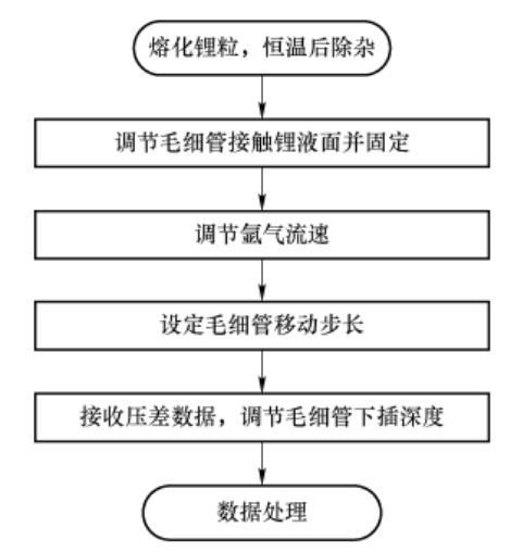 被測材料為鋰粒,純度為99.974%,總金屬雜質為260×10-6。鼓泡所用氣體為高純氬氣,純度≥99.999%,符合GB/T 4842—2017標準。為避免高溫環境下雜質對實驗結果的影響,將實驗臺架放置在充氬氣環境的手套箱內,箱內壓力為+200~400Pa,氧含量小于0.5×10-6,水含量小于0.2×10-6。實驗基本流程如圖3所示。