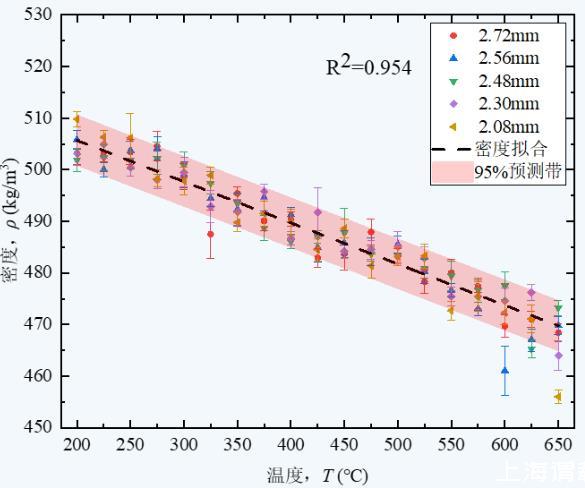 上圖5給出了溫度T在200~650℃范圍內,使用不同管徑毛細管測量的液態鋰密度實驗值及其擬合曲線。可知,擬合結果具有良好線性度。各個溫度點的密度實驗結果偏差小于±5 kg/m3,相對誤差為±1%,且實驗結果均在線性擬合95%預測帶中,其中預測帶表示對多次實驗結果分析,充分考慮實驗偶然誤差,單次實驗結果在預測帶之間,說明實驗結果具有較好可信度。